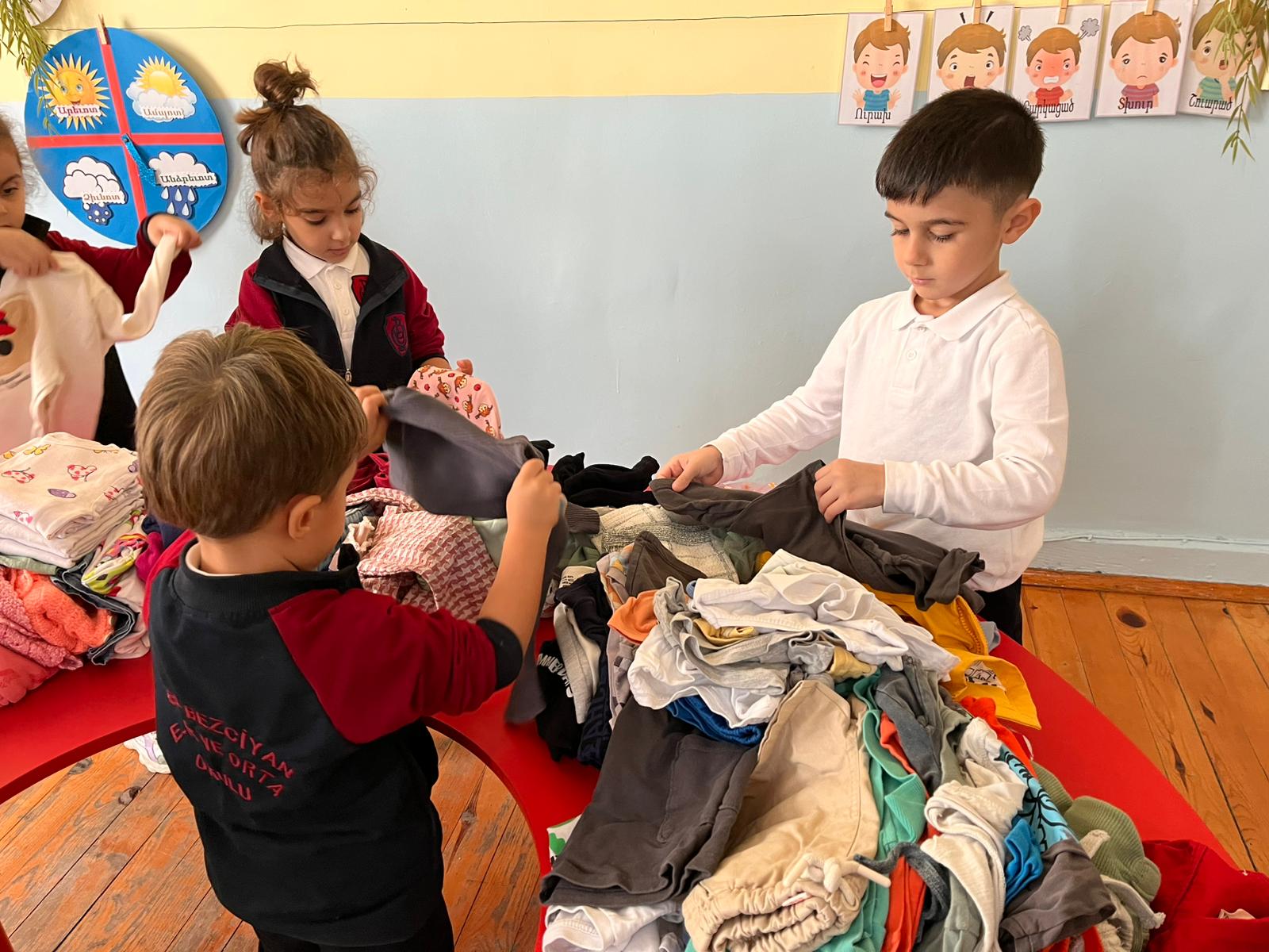 Minik öğrencilerimiz, evlerinden getirdikleri temiz ve kullanılabilir kıyafetleri, ihtiyaç sahibi çocuklara ulaştırılmak üzere büyük bir özenle bir araya getirdi.